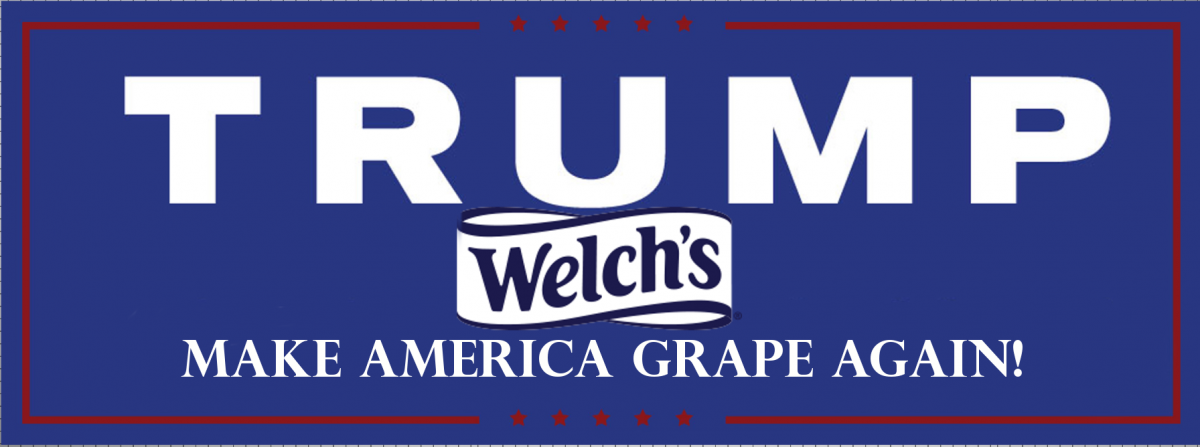 In a possibly extra-Constitutional move, Mr. Trump planned for the first time in America’s history, to name a company, in its entirety, as his President running mate for the 2016 United States Presidential race. This company, Welch Foods Inc., known primarily for its fruit juice products, would have caused an amendment to Trump’s original campaign slogan of “Make America Great Again” to a new, revised slogan saying “Make America GRAPE Again. TM, Welch Foods Inc., All Rights Reserved.” While Senator Cruz and Governor Kasich were quick to criticize this reported move when it was leaked, additional sources have confirmed that both Cruz and Kasich were planning similar moves, having already been aware of Trump’s plans to unite himself with a grape juice company to strengthen his 2016 Presidential ticket.