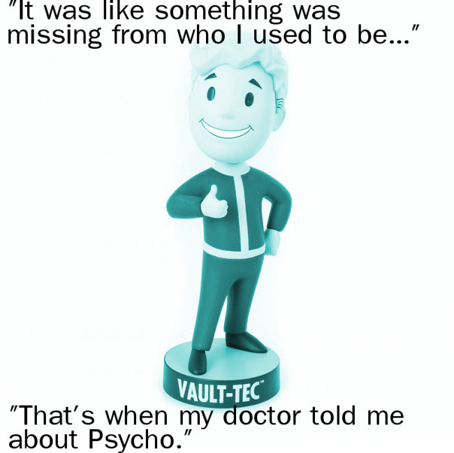 Psycho is a trademark of absolutely no one, as it does not currently exist. Opinions expressed in the above parody of an advertisement have not been evaluated by the FDA, and are not certified to diagnose, treat, or in any way affect medical conditions in the real world, only in the fictional Fallout Universe. If you feel you may have symptoms of Wasteland Unnecessary Savior Syndrome, please consult your doctor in addition to a trained clinical psychologist or close personal friend who can pray for you.